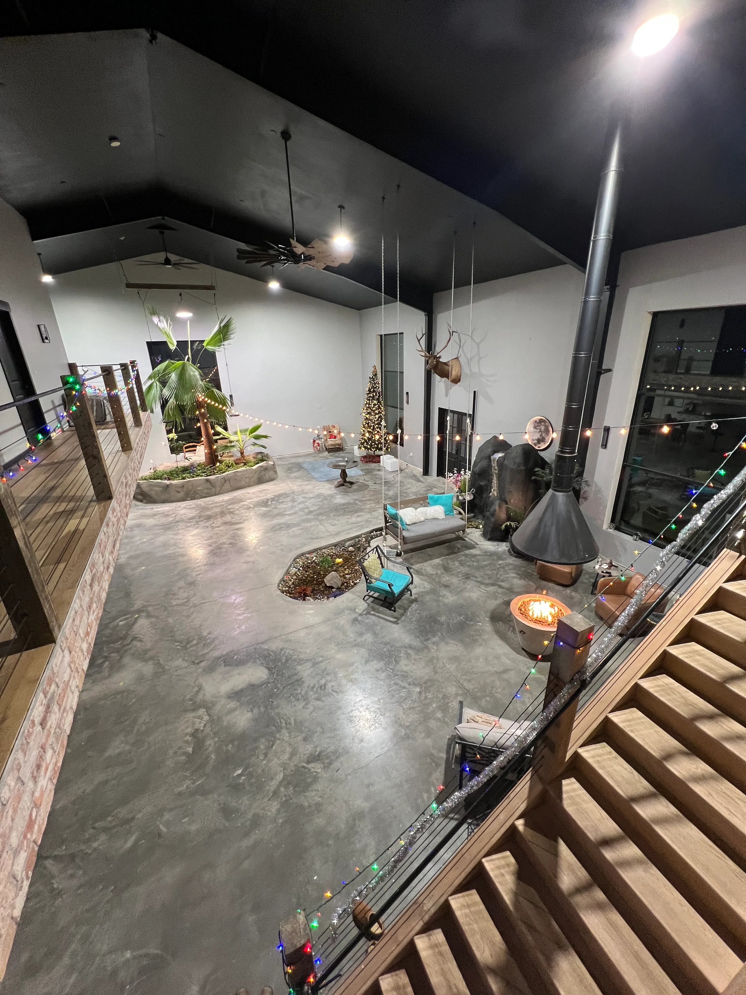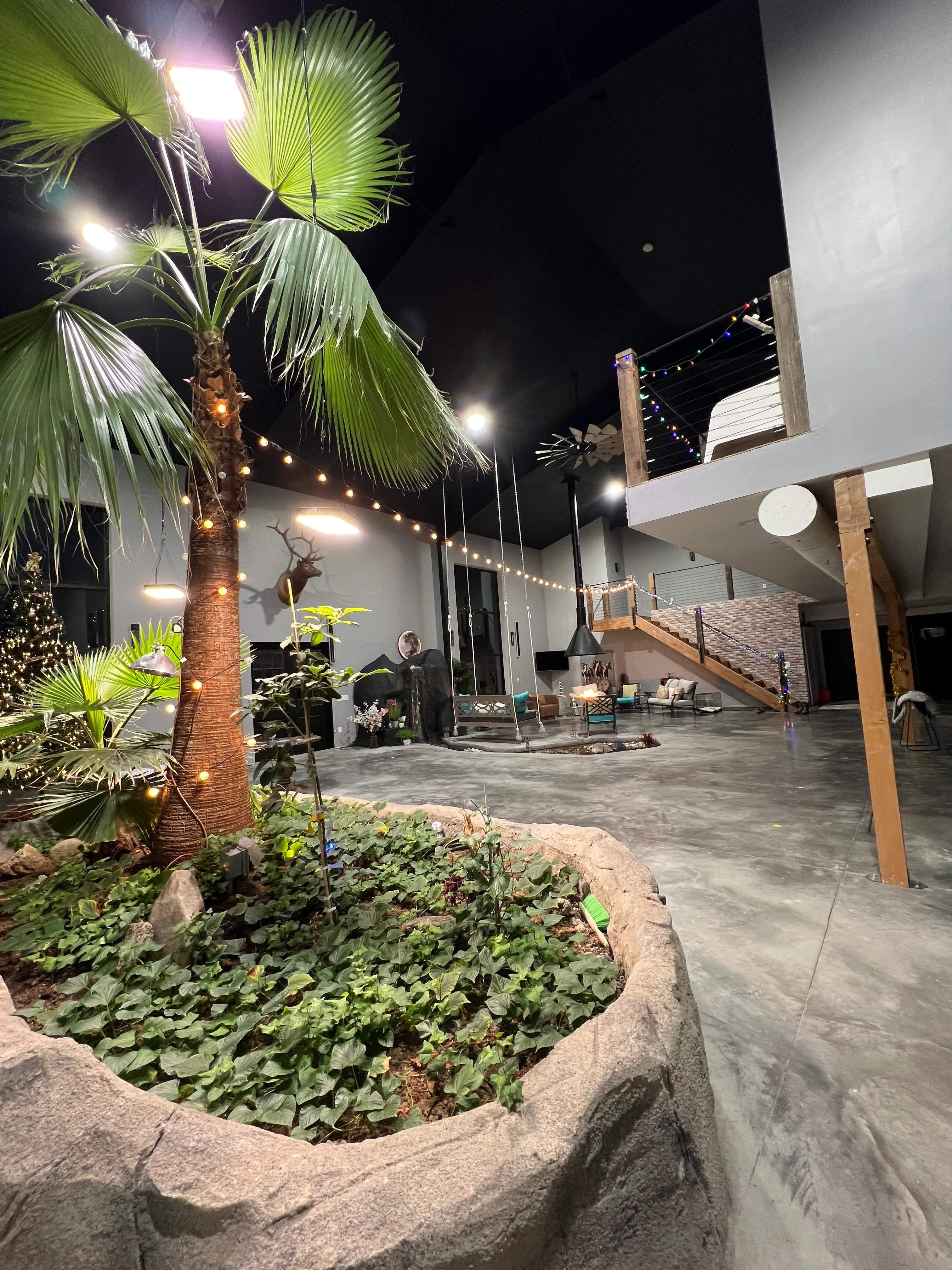 The open-concept layout features polished concrete floors, soaring ceilings, ambient string lighting, and unique statement décor elements that create a stylish yet comfortable atmosphere. Cozy lounge seating areas, a dramatic indoor fire feature, and natural accents make the space both elegant and relaxed—ideal for events that want to feel elevated without being stuffy.