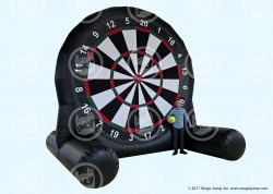 Soccer Darts. This fun interactive game combines Soccer and Darts into one inflatable fun time. Players kick a sticky Soccer ball onto the giant inflatable Dart board to see which point they can score. The inflatable has your point system just like a regular Darts game. Includes three (3) Soccer Dart balls. Great for sporting events, corporate events, fundraisers, or party rental businesses for backyard events. Good for ages 10 to adults. Has Large movie projector screen on back.